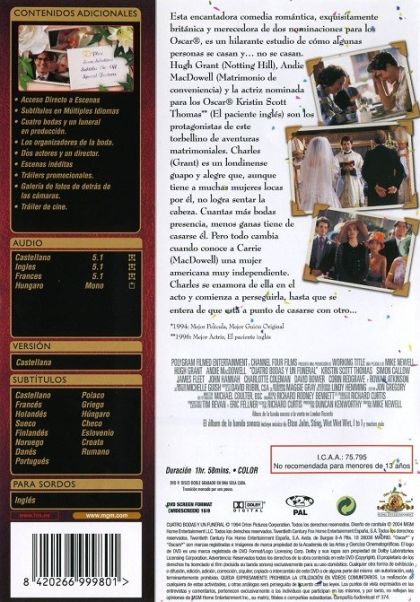 La siguiente boda es la de Carrie, en un castillo en Escocia, a la que por supuesto Charles y todos sus amigos son invitados. Éste ve con desesperación cómo la mujer a la que ama se casa con otro, y todo empeora cuando Gareth, parte del grupo de amigos y secreto compañero sentimental de Matthew, mejor amigo de Charles, muere de un ataque al corazón durante la celebración. Tras el funeral Charles reflexiona sobre lo equivocado que estaba, que siempre había creído que él y sus amigos formaban un grupo de solteros, pero que Gareth y Matthew en realidad eran un matrimonio que habían encontrado el verdadero amor, y cree que algunos como él nunca lo lograrán.