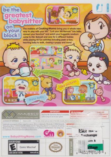 Bundle includes your own Mama Baby. Insert the Wii Remote into your own Cooking Mama plush life sized doll and bring it to life! Mama will show you how to take good care of your baby and be a good babysitter - just like Mama! Play along with Mama and do everything a real babysitter would do. Mama will teach you how to keep your baby happy and healthy!