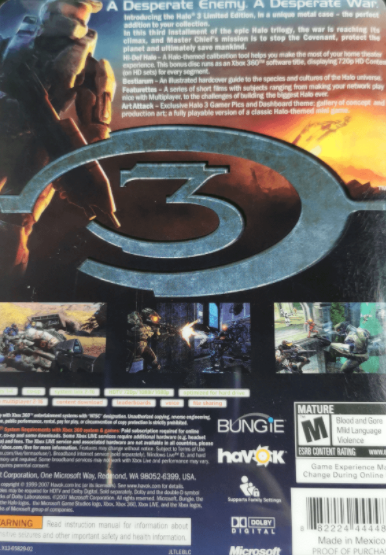 In "Halo 3," the third installment of this legendary epic, the war has come to a climax -- the Flood continue to grow in numbers and strength, the armies of Earth are scattered and decimated, and the Covenant threaten to activate the Halo, effectively destroying all life in the galaxy. Master Chief's mission: to stop the Covenant, destroy the impending Flood threat and ultimately save mankind.