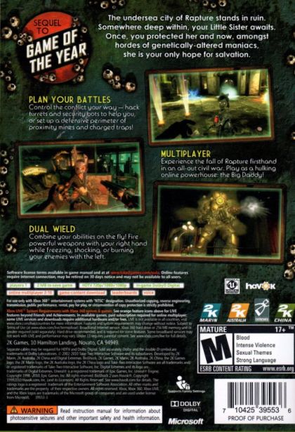 Multiplayer in BioShock 2 provides a rich prequel experience that expands the origins of the BioShock fiction. Set during the fall of Rapture, players assume the role of a Plasmid test subject for Sinclair Solutions, a premier provider of Plasmids and Tonics in the underwater city of Rapture that was first explored in the original BioShock. Players will need to use all the elements of the BioShock toolset to survive as the full depth of the BioShock experience is refined and transformed into a unique multiplayer experience that can only be found in Rapture.