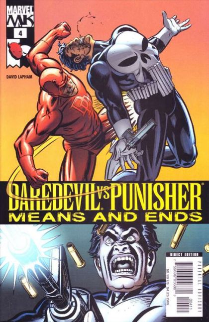 Written by David Lapham Pencils & Cover by David Lapham Amid a brutal Indian summer, Hell's Kitchen is on the brink of chaos. Hammerhead has placed a $10 million bounty on the Punisher's head, and it's created a minor war zone in Daredevil's backyard. As every two-bit thug and hired assassin tries to take the Punisher out, the vigilante fires back - embarking on a killing spree. Now Daredevil - the new self-proclaimed Kingpin of the Kitchen - takes matters into his own hands, deciding to take out the Punisher and end the debate over ways and means once and for all! Cover price $2.99.