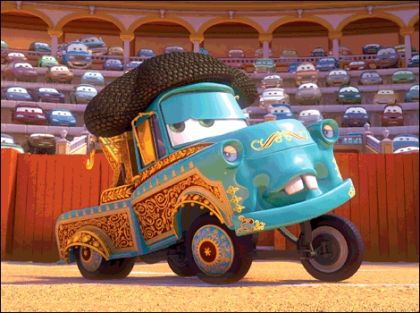 Mater is a matador fighting a herd of bulldozers in Spain. When Lightning McQueen enters the story, the bulldozers begin to chase him due to his red paint.