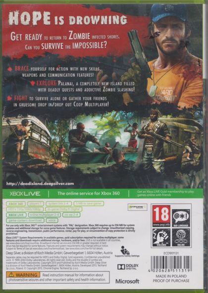 Dead Island Riptide takes players to the island of Palanai on the Banoi archipelago, infested with bloodthirsty Zombies and only a few remaining Survivors still fighting for their lives. Introducing new terrifying enemies, deadly weapons, a new playable character and much more, Dead Island Riptide will draw players back into a world that has grown corrupt - with the last rays of hope vanishing in rising tides.