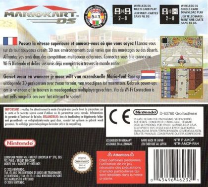 Time to race...no wires attached. The acclaimed Mario Kart series has gone wireless, letting players race and battle with up to eight karts at once, regardless of whether everyone has a game card. An all-star cast that includes Mario, Luigi, Peach, Yoshi, Donkey Kong, Wario, Bowser and Toad will round out a truly all-star lineup of more than 30 courses drawn from every Mario Kart game. That's right – players will tour courses from Super Mario Kart, Mario Kart 64, Mario Kart: Super Circuit and Mario Kart: Double Dash!! , not to mention brand-new tracks and arenas. With all the crazy items and frantic speed players have come to expect, this game is a Mario Kart fan's dream. The game has a new dimension of fun, since players can battle others around the world by connecting to Nintendo's new wireless gaming service, Nintendo Wi-Fi Connection, via Wi-Fi.